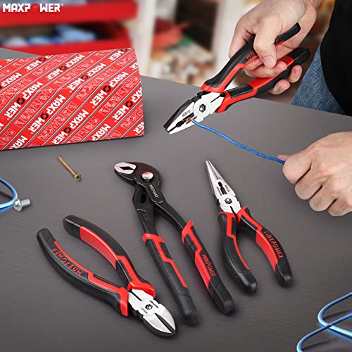 MAXPOWER 4 Piece Pliers Set, Pliers Tool Set Including 8 Inch Lineman Pliers, Diagonal Cutting Pliers & Long Nose Pliers, 10 Inch Groove Joint Pliers