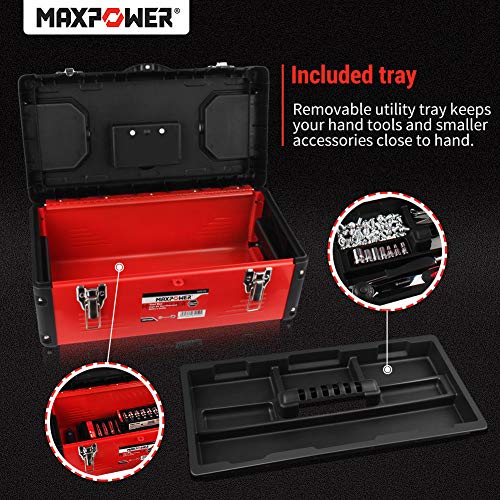 MAXPOWER 16 inch Tool Box with Removable Tray, Portable Toolbox with Stainless Steel Handle & Doule Metal Latch, Rated up to 33 Lbs