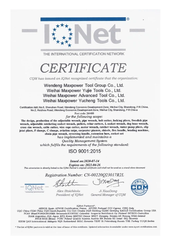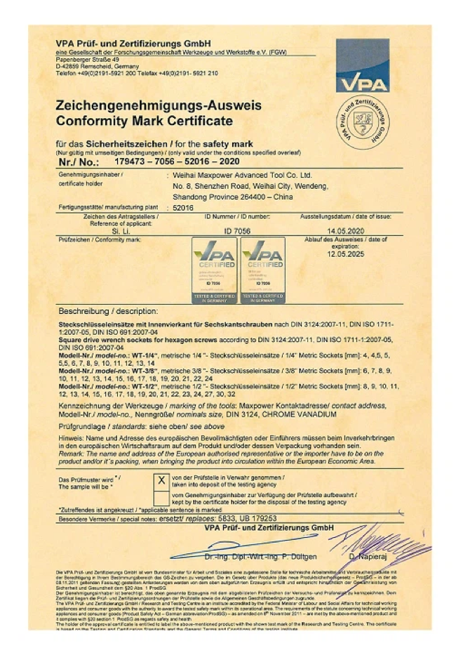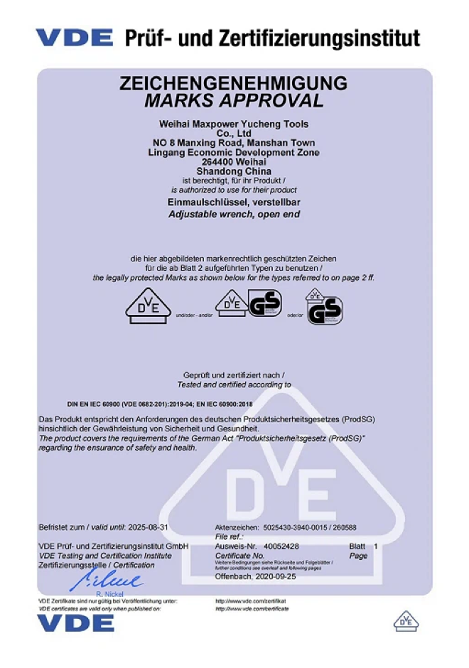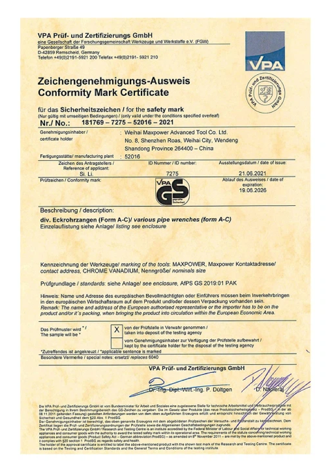Maxpower strictly implements the AAAAA standardization model and management system. Since the 1990s, it has successively passed ISO9001 quality system certification, ISO14001 environmental management system, OHSAS18001 occupational health and safety management system certification, and Japan JIS, Germany VPA/GS, Korea KS, BSCI, VDE and other product certifications. Meanwhile, Maxpower owns a national- level technology center and internationally - recognized CNAS certificated laboratory in the hardware tools industry.
